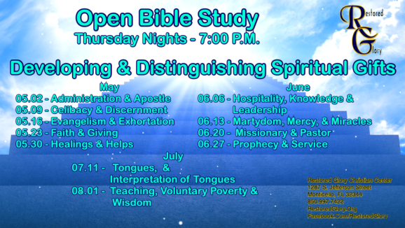 Developing & Distinguishing Spiritual Gifts Did you know that your spiritual gift is vital to the body of Christ?! If you’ve ever wondered what gifts you possess or if you’d like to have better understanding of spiritual gifts come out and join us on Thursday nights at 7:00 p.m.